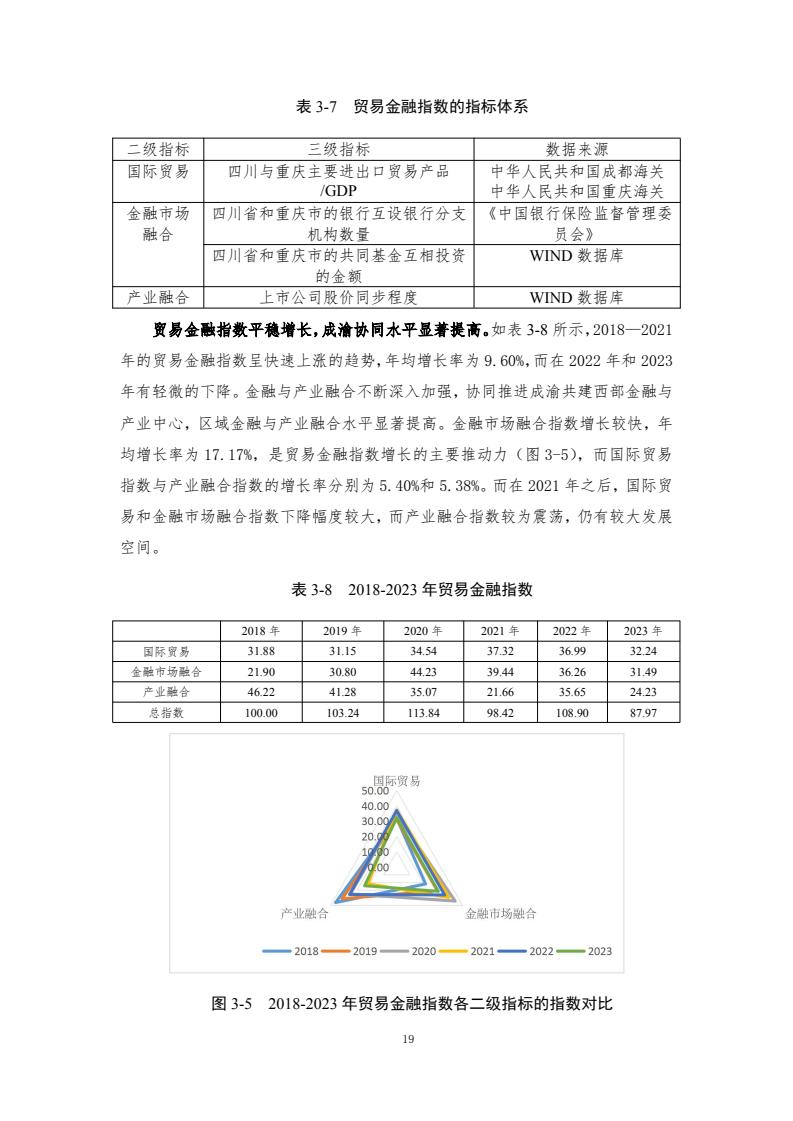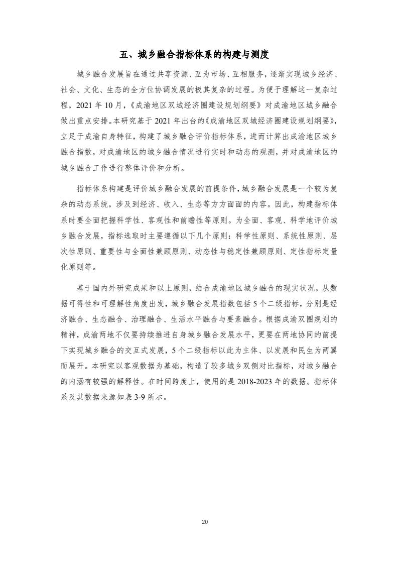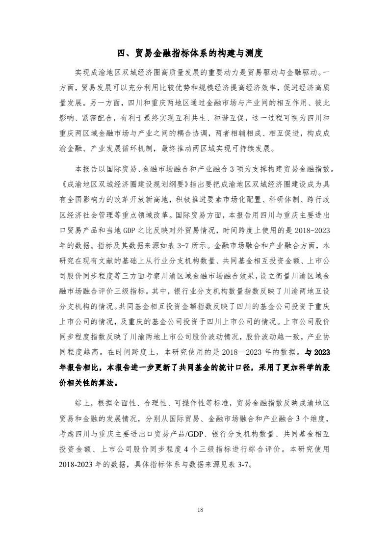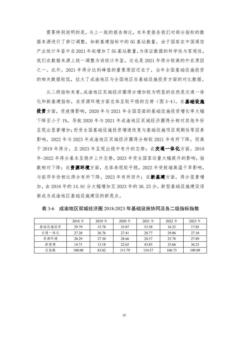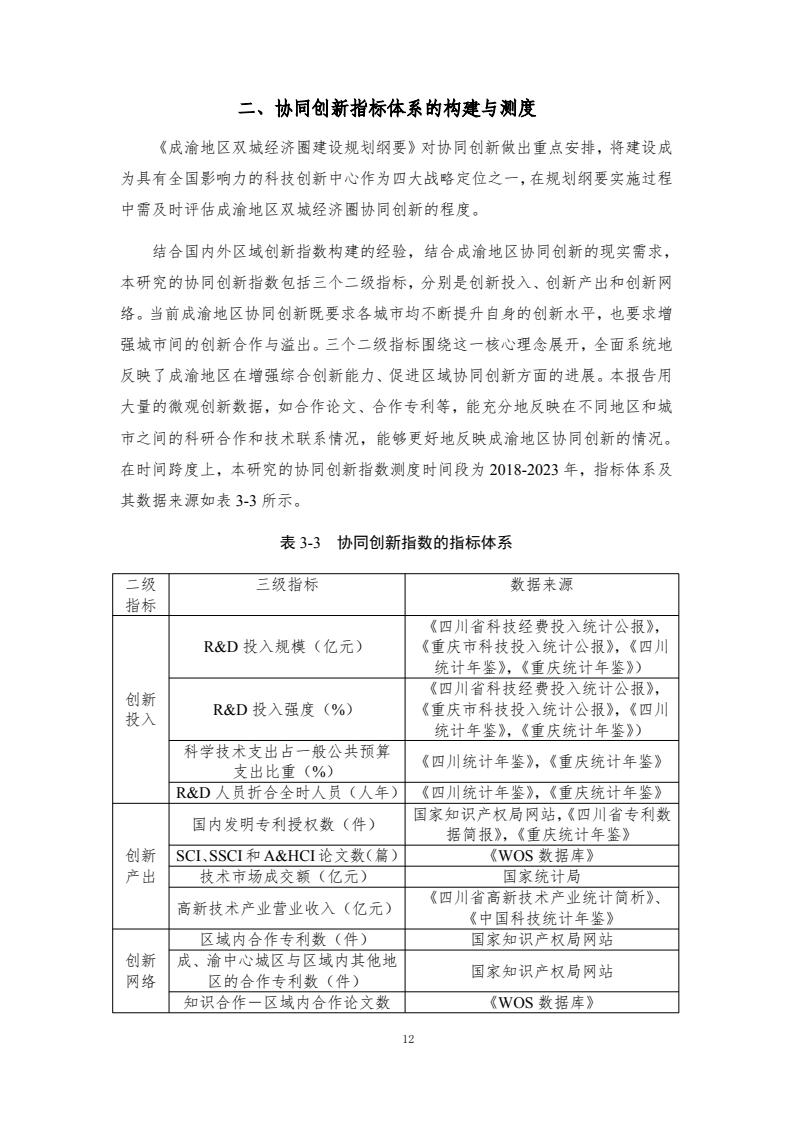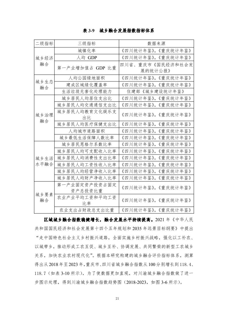 成渝双城经济圈协同发展指数评价体系包含6个一级指标和各自对应的若干二级指标、三级指标,主要评价以重庆和成都两中心城市为核心的成渝城市群2018-2023年度的发展情况。2018—2023年,成渝双城经济圈协同发展指数分别为100.00、101.59、117.79、125.84、122.90和 121.50,前四年逐年增长,2022年和2023年稍有下降,但仍然处于较高水平。反映了成渝地区的快速发展以及经济韧性。