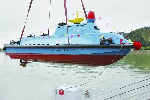 可潜无人艇是将水面高速艇与水下潜器相结合的一种新船型。“蓝鲸号”长11米、排水量12吨,水面航速达30至40节,水面续航达数百公里,可实现数十米深的下潜和水下航行,能在水下静态悬浮一个多月,随时响应突发任务。