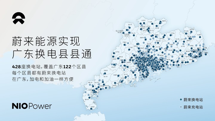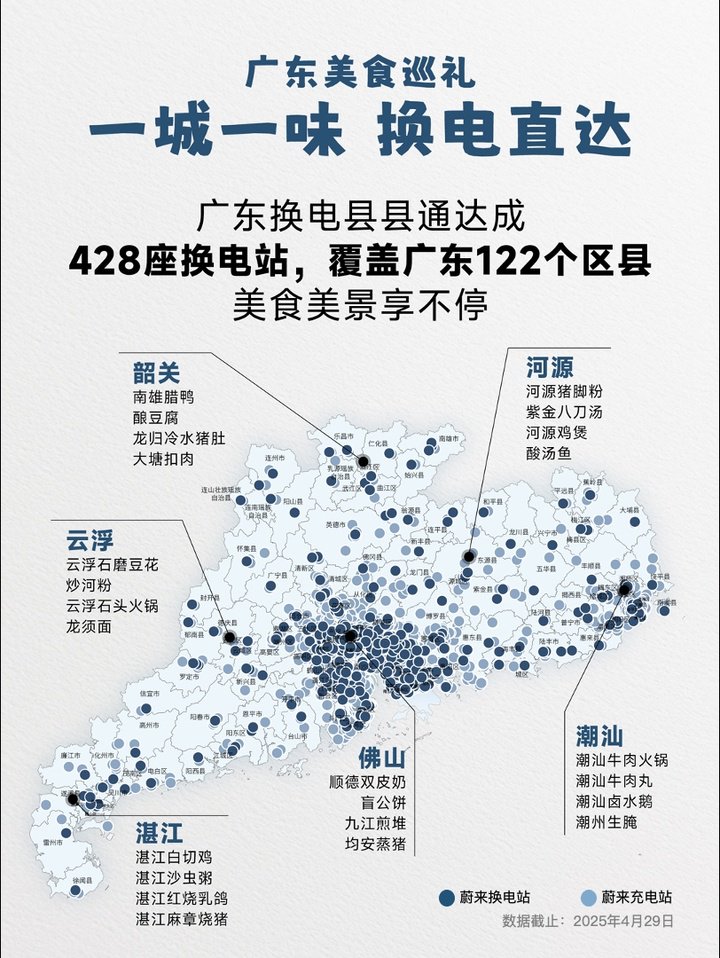 2025 年 4 月 29 日,湛江市赤坎区和徐闻县的两座充换电一体站同时投运,标志着蔚来在广东实现了「换电县县通」——广东省 122 个区县,全部覆盖换电站。