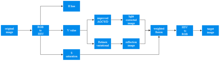 首先,将输入的图像从RGB颜色空间转换到HSV颜色空间。在这个过程中,微云全息保留了H分量和S分量的数据,这是因为这些分量包含了图像的色调和饱和度信息。然后,对V分量进行Retinex变分处理。这种处理能够提取出图像的亮度信息,形成一张包含图像细节信息的反射图像。然而,此时容易有反射图像过度增强的现象,为了解决这个问题,微云全息引入了改进的AGCWD方法来处理原始的V分量。这种处理方法能够有效地抑制过度增强的问题,并将处理结果作为光照矫正图像与反射图像进行加权融合。在这个融合过程中,微云全息将光照矫正图像和反射图像按照一定的权重进行组合,以产生一个新的V分量。这个新的V分量既包含了原始图像的亮度信息,又矫正了过度增强的现象。最后,将新的V分量从HSV空间转换回RGB空间,以生成最终的增强图像。具体流程如下图所示,包括颜色空间转换、Retinex变分处理、AGCWD处理、加权融合以及最后的颜色空间转换回RGB。