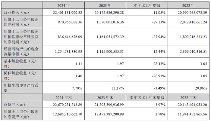 公司坚持产品技术创新,持续开拓国内外市场,夯实核心竞争力,2024年取得了不错的业绩:实现营业收入224.01亿元,同比增长11.05%,再创历史新高;实现归母净利润9.71亿元。