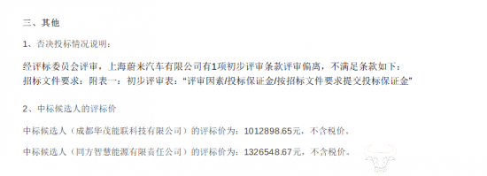 但长安汽车的此次招标公告显示,上海蔚来汽车有限公司不满足招标文件中“评审因素/投标保证金/按招标文件要求提交投标保证金”一项,也不知道是评审因素还是未交招标保证金,如果没交投标保证金的话,那就是只报名,并未实际参加投标。