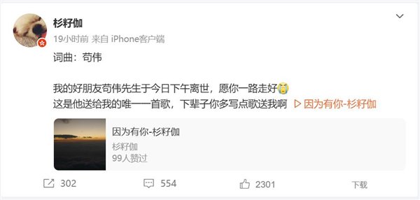 5月7日消息,歌手杉籽伽在社交平台上发文称,我的好朋友苟伟先生于5月6日下午离世,愿你一路走好。