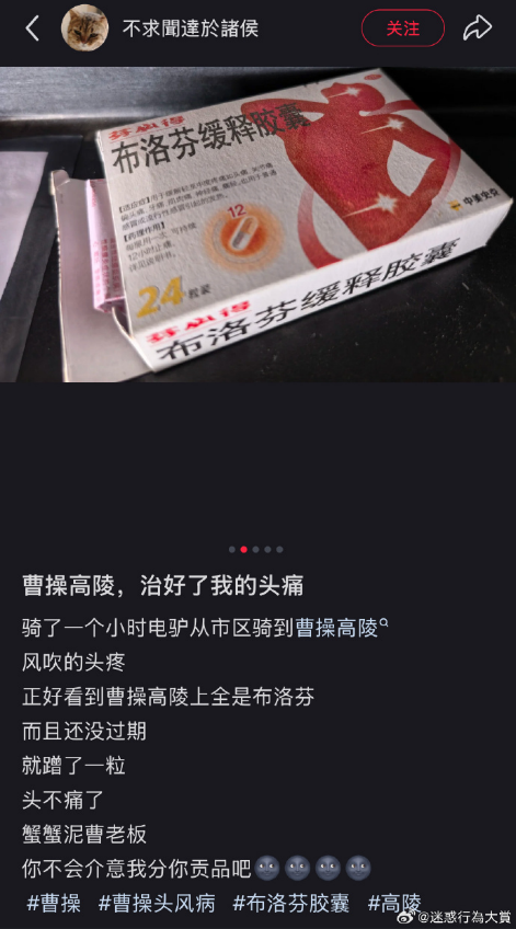 图片来源于网络曹操高陵的供品里也常有热心群众带去的布洛芬。曹操逝者已矣,无法受用,倒是惠及了前去拜访的头痛网友。前人栽树,后人乘凉。