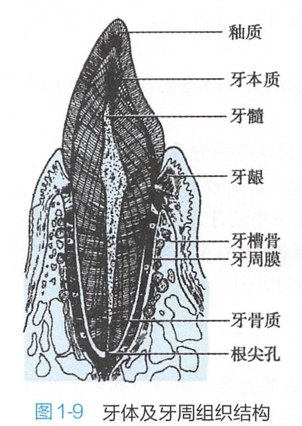图片来自参考文献[3]牙冠最外层是牙釉质,为半透明的钙化组织,是人体最坚硬的组织;釉质下面是淡黄色的牙本质,硬度低于釉质。牙本质里面有痛觉感受器,受到刺激时会产生酸痛感;牙本质内是牙髓,为疏松结缔组织。