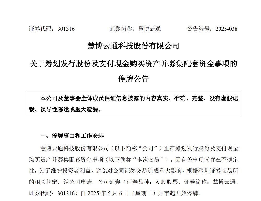 为避免对公司证券交易造成重大影响,慧博云通股票自2025年5月6日起停牌,预计停牌时间不超过10个交易日。
