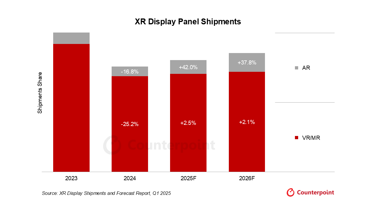根据Counterpoint最新的XR面板出货量和预测报告,预计到2025年,全球XR (AR/VR)面板出货量将同比增长6%。虽然AR仍然是一个相对小众的细分市场,但它的年增长率将达到42%,而VR的年增长率仅为2.5%。市场将受到新型AR智能眼镜推出的推动,这种眼镜将显示屏用于支持人工智能的应用程序,而不是观看视频。