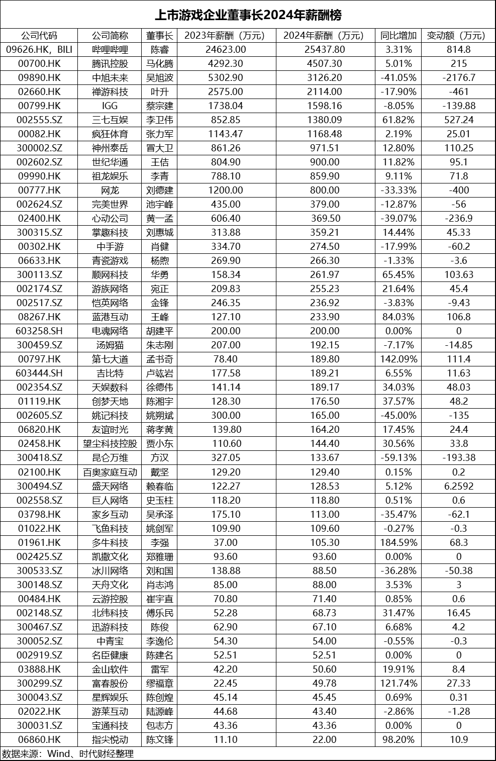 同时,第七大道(00797.HK)董事会主席孟书奇、神州泰岳(300002.SZ)董事长冒大卫、蓝港互动(08267.HK)董事会主席王峰、顺网科技(300113.SZ)董事长华勇2024年薪酬增长超100万元,分别涨薪111.4万元、110.25万元、106.8万元、103.63万元,分别同比增加约142.09%、12.8%、84.03%、65.45%。