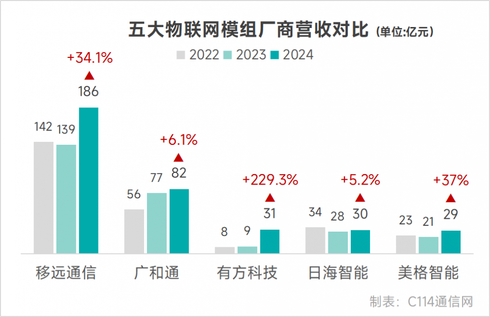 值得注意的是,2024年,有方科技营收增长率为229.3%,增速惊人,一跃成为行业第三大厂商,成为名副其实的黑马。此外,营收增长较快的还有移远通信和美格智能,两家增速均超过30%。
