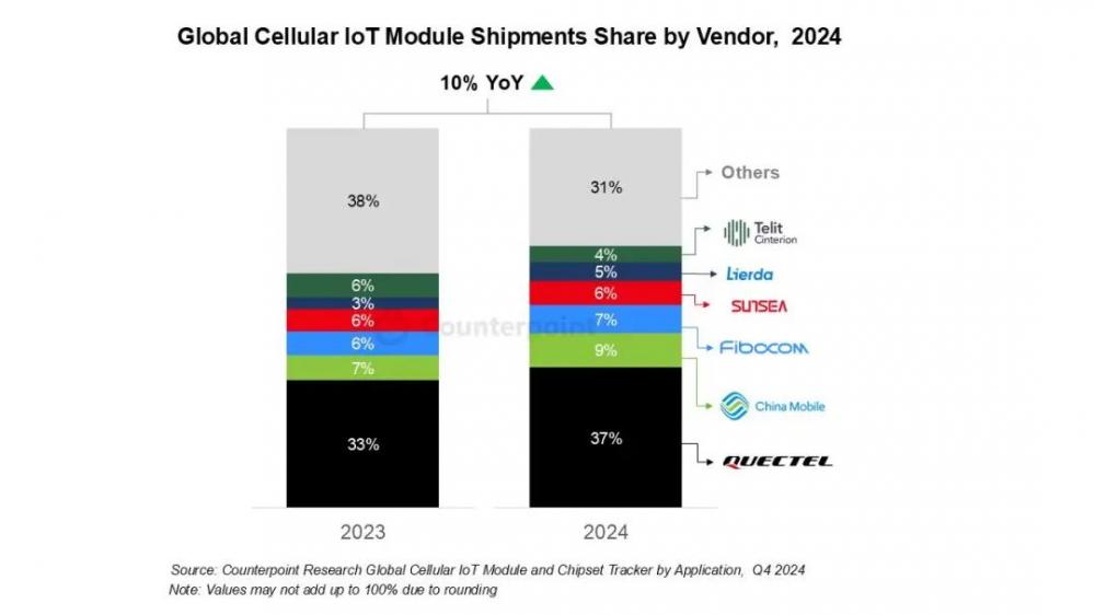 此外,Counterpoint表示,2024年,蜂窝物联网模组行业整合趋势加剧,主要行业参与者通过战略收购和业务组合重组来应对市场变化。Qualcomm 收购 Sequans 的 4G 技术,同时,u-blox 完全退出蜂窝模组领域,反映出中型企业在面临价格压力和技术需求变化时,维持盈利能力所面临的日益严峻挑战。