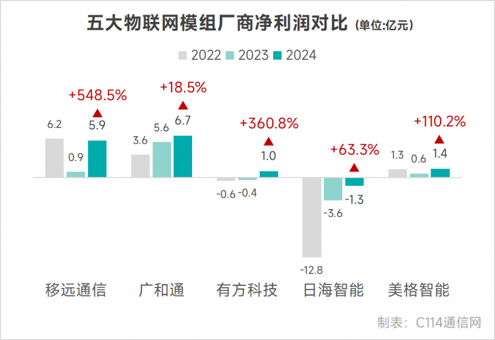 C114讯 5月8日消息(章葭)日前,国内五家主业物联网模组的上市公司——移远通信、广和通、日海智能、美格智能、有方科技,2024年年度报告全部出炉。