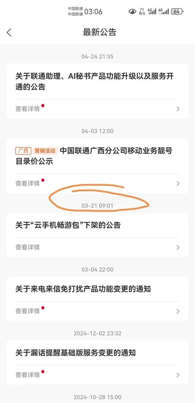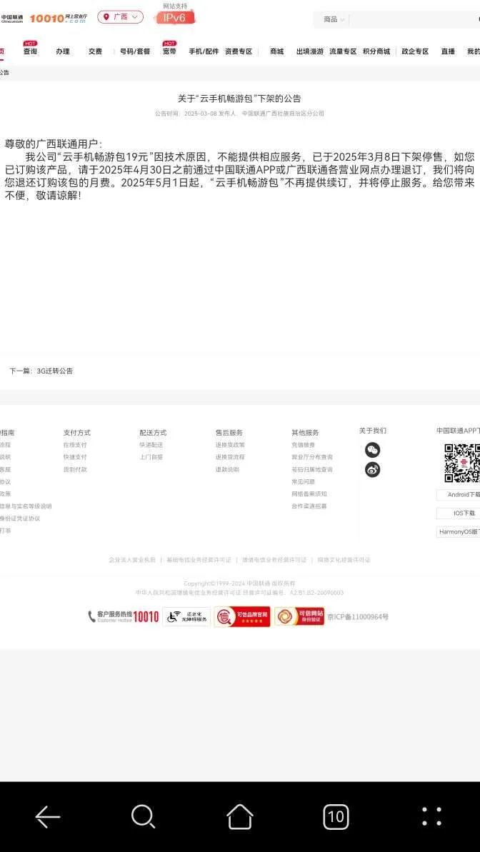 可是当晚订购了该业务后,系统只是给与用户自动添加了5G网络服务质量VVIP,与宣传的5G-A网络服务严重不符,由此引发了用户的强烈不满投诉,由于当时的时间点比较敏感(你懂的),为了避免用户大规模投诉,3月8日晚,广西联通紧急给手厅一线客服赋权,只要办理了云手机的用户均可以添加5G-A网络速率服务,即5G上网服务(下行峰值2Gbps上行峰值200Mbps),本人在当晚也通过手厅添加了该服务,原以为广西云手机服务包事件到此结束,万万没想到广西联通在3月19日上午9点09分发布了公告,并将公告的发布时间修改为3月8日,并以云手机技术故障为由强制毁约强硬告知用户5月1日不在提供服务,倚仗其对用户不对等的技术信息优势,强制退订用户已经办理的合法业务。