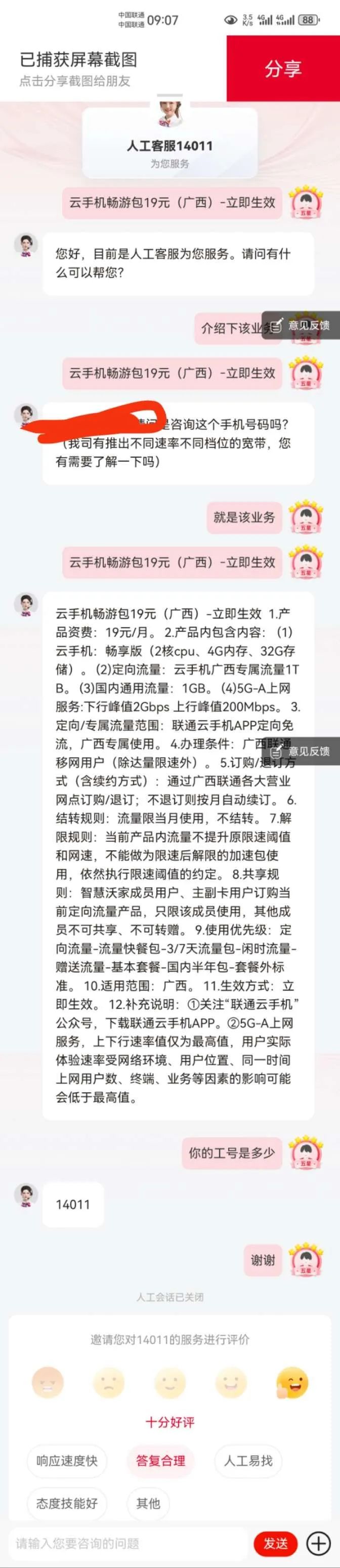 2025年3月7日晚,本人通过中国联通手机营业厅广西老用户专区,办理了广西联通“云手机畅游包19元(广西)﹣立即生效”的业务。
