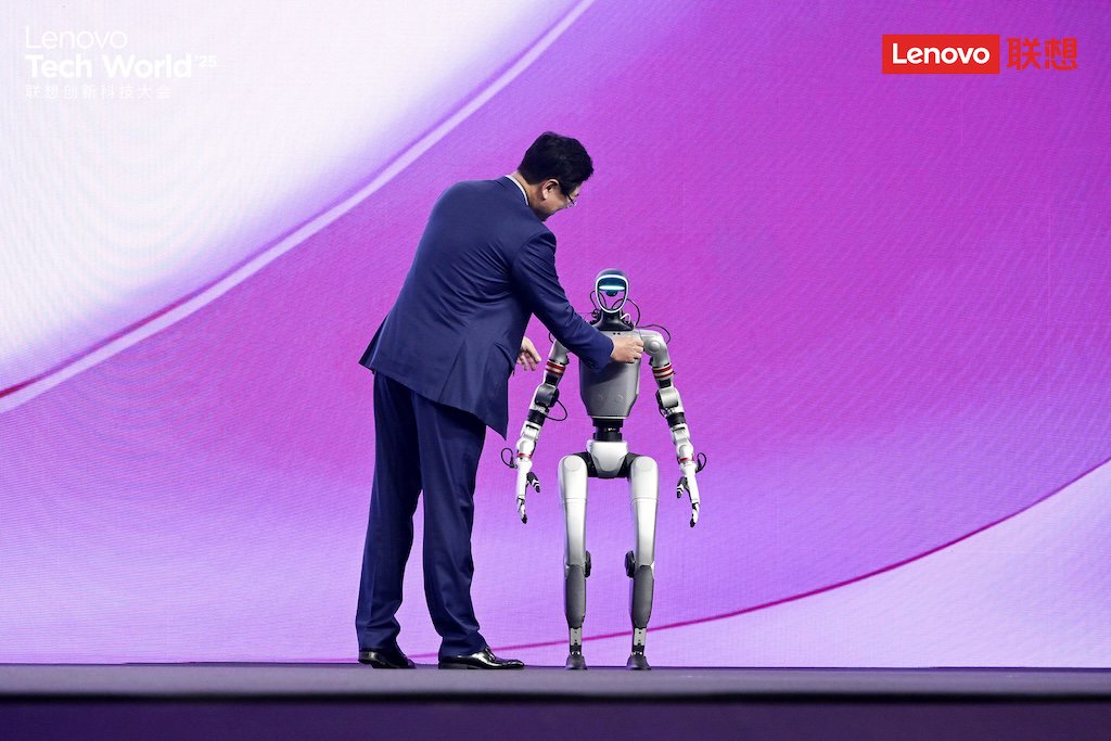 当天在现场,联想也将这样一个「集大成的员工」形象化了,请出来一台人形机器人「乐享壹号」。虽然走路还有点慢,但这台机器人还是在秀了一段太极、和 Boss 杨元庆合影之后,拿到了联想的工牌,成为公司「首位硅基员工」。