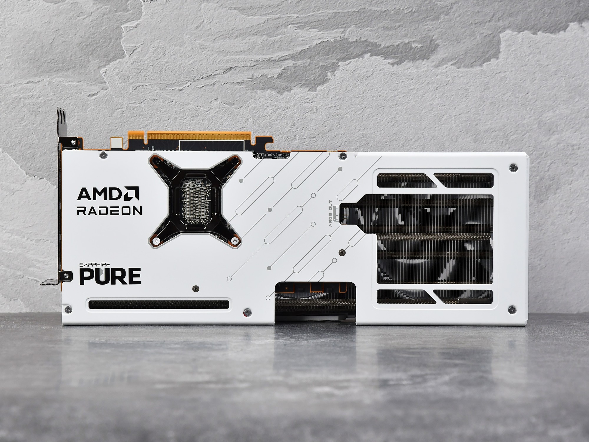 蓝宝石PURE 极地 RX 9070 GRE 12G D6 OC显卡背部采用一体式金属背板,可保护PCB的同时加强散热,尾部有大面积镂空部位辅助快速散热。