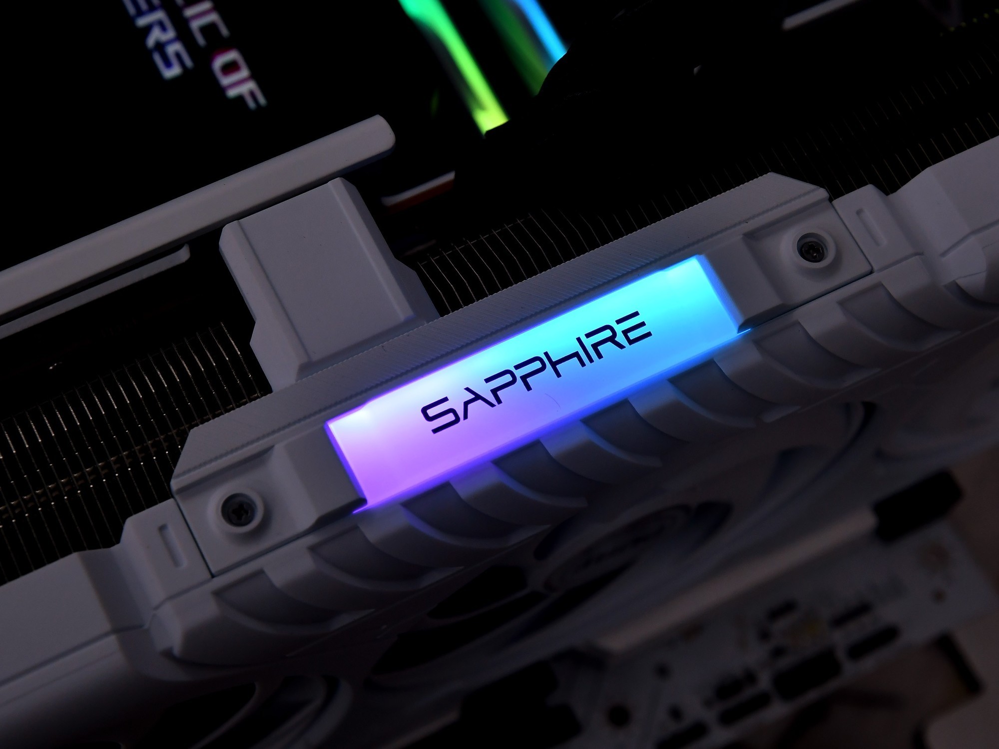显卡侧面采用了一块蓝宝灵动岛RGB光效系统,上机后默认开启RGB灯效,通过TRIXX 调节光效功能,可自定义灯光颜色,强度和模式。同时还支持外部模式,通过5V 3PIN连接线可以与整机RGB光效联动。