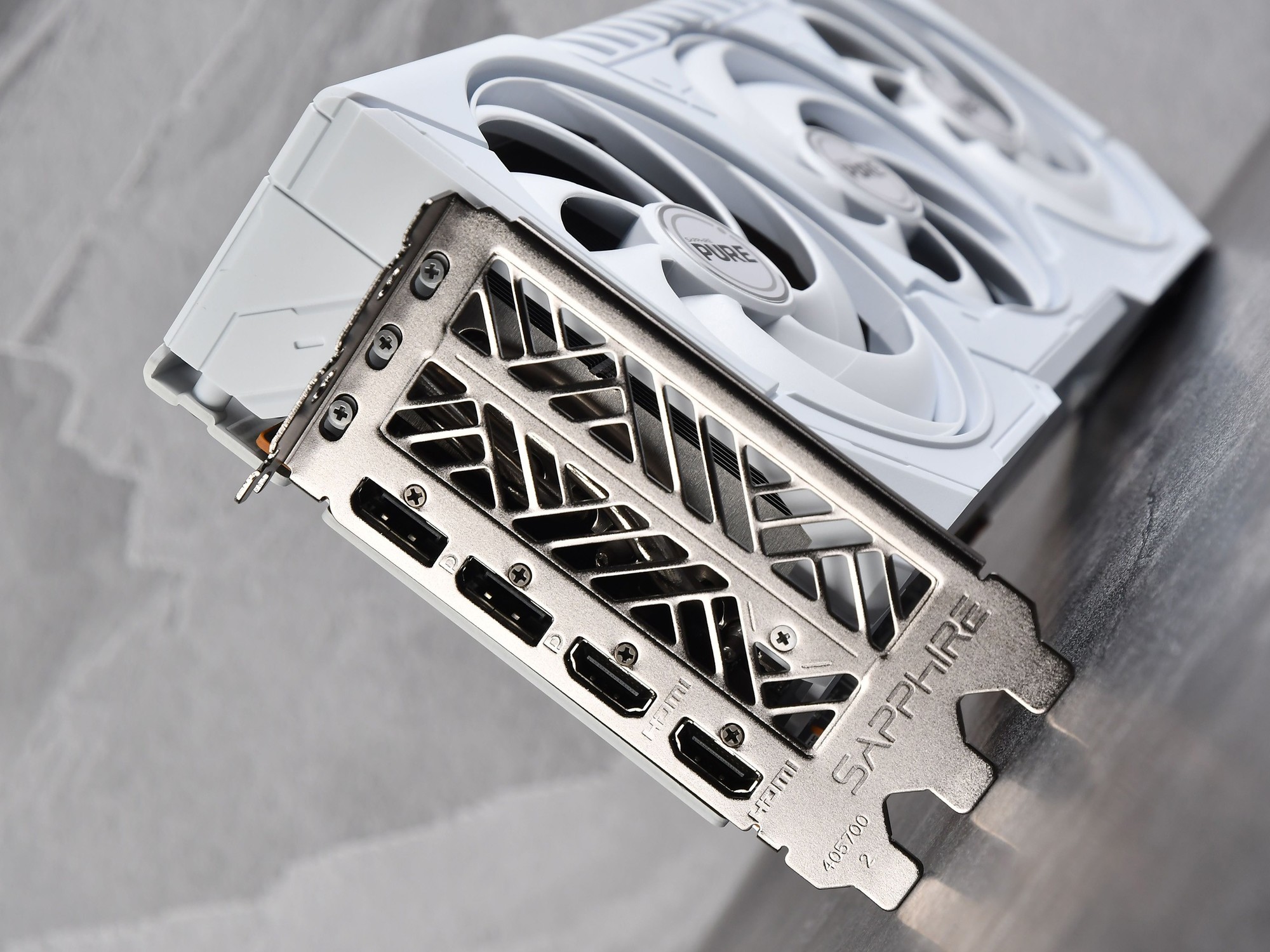 蓝宝石PURE 极地 RX 9070 GRE 12G D6 OC的整卡厚度为3槽,视频输出接口采用了HDMI 2.1b*2+DP 2.1a*2的设计,可实现高达8K 144Hz的超高分辨率和刷新率,具有12位HDR和全REC 2020色彩空间。