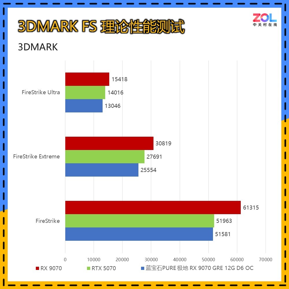 在针对显卡DX11性能的3DMARKFS套装测试中,共有3款显卡进行对比,除了本次评测的产品还有基础型号RX 9070以及N卡的RTX 5070。