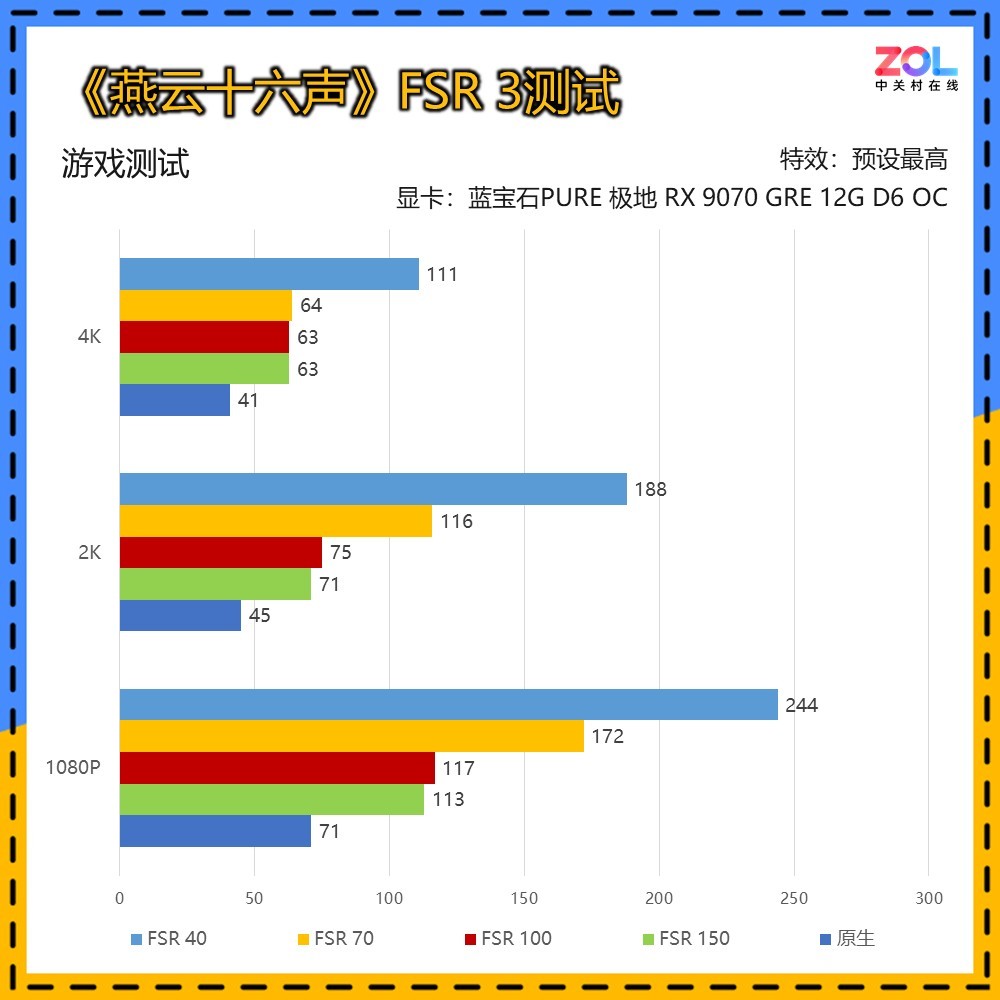 可以看到蓝宝石PURE 极地 RX 9070 GRE 12G D6 OC在FSR 150和FSR 100的缩放区间帧数完全相同,该区间内的调节对游戏分辨率并无影响。