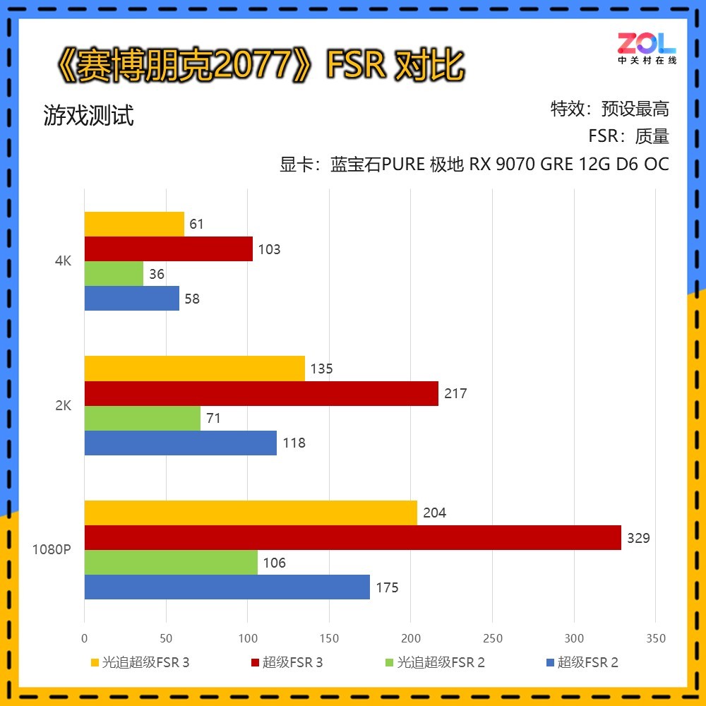 在《赛博朋克2077》中,测试分为【超级】画质与【光追超级】画质,固定FSR质量挡位。可以看到在开启FSR 3帧生成后,帧数有着质的飞跃,几乎达到FSR 2的2倍。