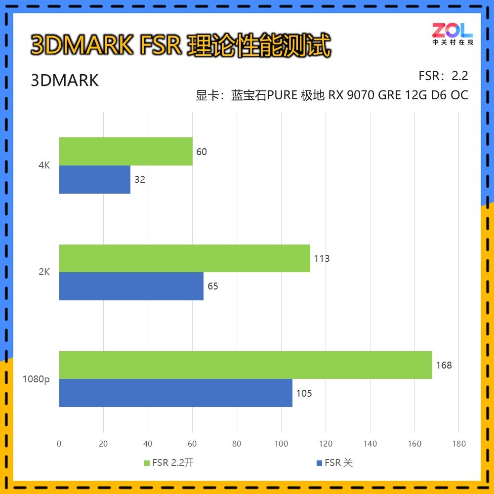 在3DMARK的FSR测试中,比较接近于实际的游戏帧数表现,可以看到在开启FSR 2的时候,这张蓝宝石PURE 极地 RX 9070 GRE 12G D6 OC显卡可在2K分辨率下以百帧以上的帧率流畅运行。