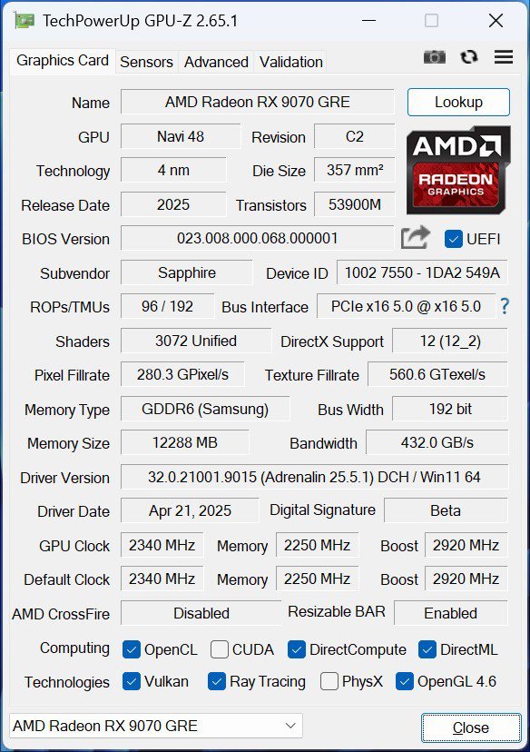 规格方面,RX 9070 GRE拥有3072个流处理器,此前的RX 9070为3584个,采用RDNA4架构,Navi 48核心,拥有12GB GDDR6显存,显存位宽为192 bit,带宽为432 GB/s。