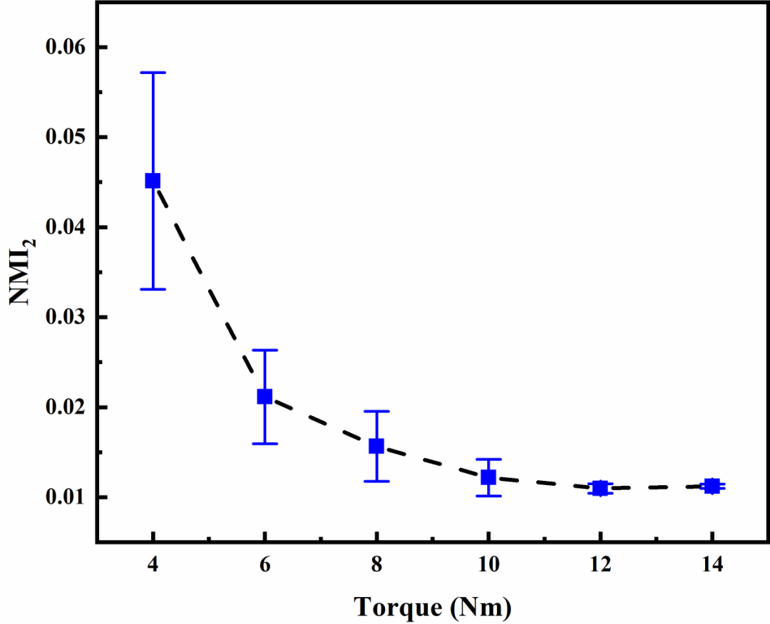 实验结果表明,利用振动声调制信号的调制特征计算得到的非线性调制指数随着螺栓扭矩的增大呈现单调递减的趋势,当螺栓扭矩较小时,非线性调制指数下降较快,当螺栓扭矩接近标准预紧力矩时,非线性调制指数下降非常平缓,这说明振动声调制法能够检测螺栓的松动程度,可以用非线性调制指数来量化螺栓的松动程度。