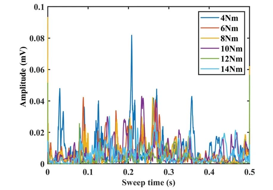 在螺栓连接处经振动声调制之后的信号由另一侧的压电陶瓷片接收,并输送到示波器和数据采集卡分别进行信号观测和采集,在PC机上进行信号分析。实验过程中利用高精度扭矩扳手控制螺栓的拧紧力矩,从而改变螺栓的松动程度,在不同螺栓松动程度下分别进行振动声检测。