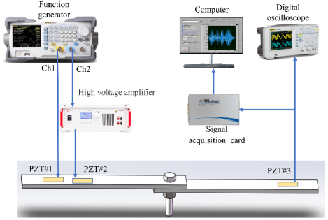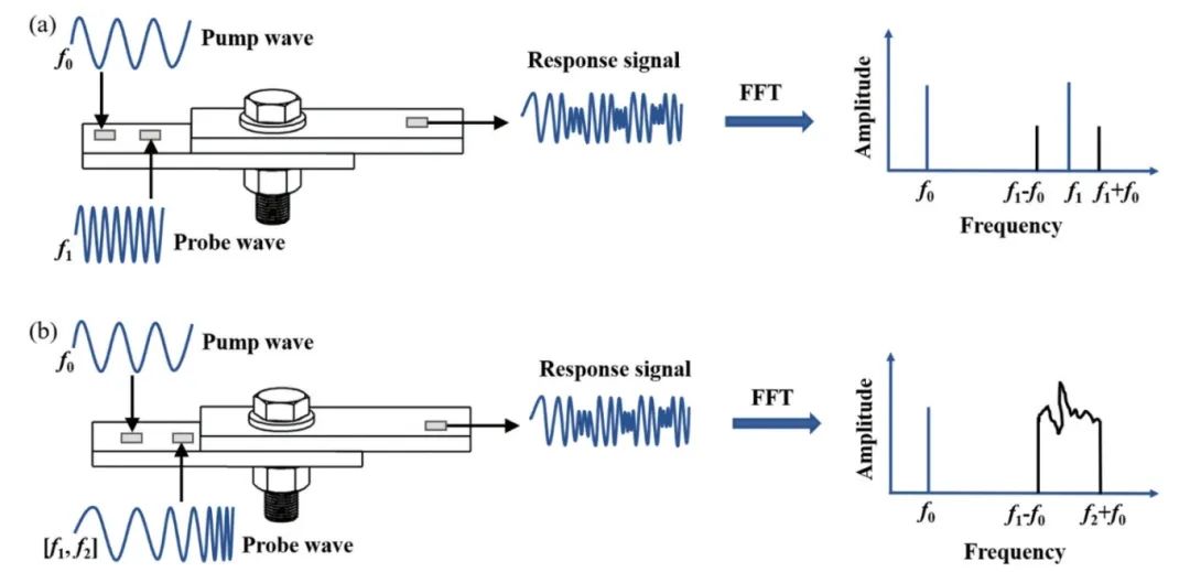 采用单螺栓结构,将接收与激发压电陶瓷分别紧密粘贴于结构两侧,激发侧贴有两篇压电陶瓷,一片用于激励低频泵浦波,另一篇用于激励高频探测波。泵浦波和探测波的信号由函数信号发生器产生,探测波直接输出到压电陶瓷,而泵浦波则经过功率放大器放大后输出到压电陶瓷。
