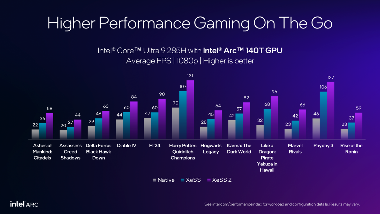 移动端玩家也想获得更佳体验?没问题!搭载英特尔锐炫GPU的英特尔®酷睿Ultra处理器(第二代)已全面支持XeSS 2。以英特尔®酷睿™Ultra 9 285H处理器(内置英特尔锐炫140T GPU)为例,在相同游戏测试中,帧率稳定达到40帧以上,而多款大作轻松突破60帧。其中《漫威争锋》高画质模式下帧率提升187%,从原生23帧跃升至XeSS 2加持下的66帧。