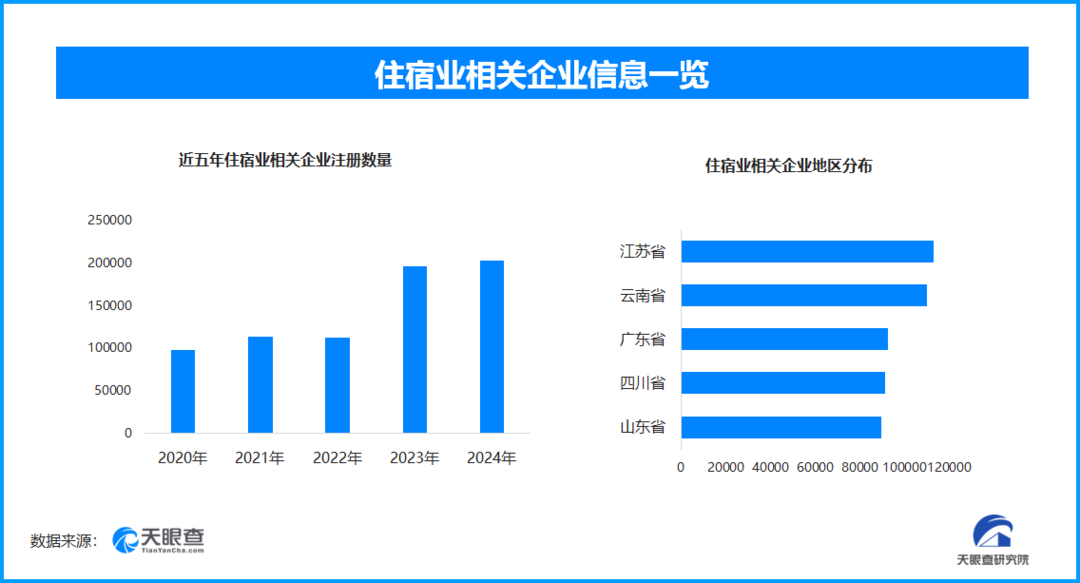 天眼查专业版数据显示,截至目前我国现存在业、存续状态的住宿业相关企业超156.1万家。其中,2025年截至目前新增注册相关企业约8.9万余家,从企业注册数量趋势来看,近五年间,住宿业相关企业的注册数量呈现出增长态势,特别在2023、2024两年呈现出显著的增势。 从区域分布来看,江苏省、云南省、广东省住宿业相关企业数量位居前列,分别为超过11.2万余家、10.9万余家和9.2万余家。