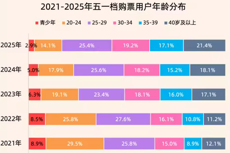 从2021年到2025年,五一档24岁以下观众占比分别为38.4%、34.3%、25.4%、22.9%、17%,20岁以下青少年观众占比分别为8.9%、8.5%、6.3%、5%、2.9%。年轻观众的逐年流失,已成五一档的一大顽疾,20岁以下青少年观众在今年更是直接下滑了42%。