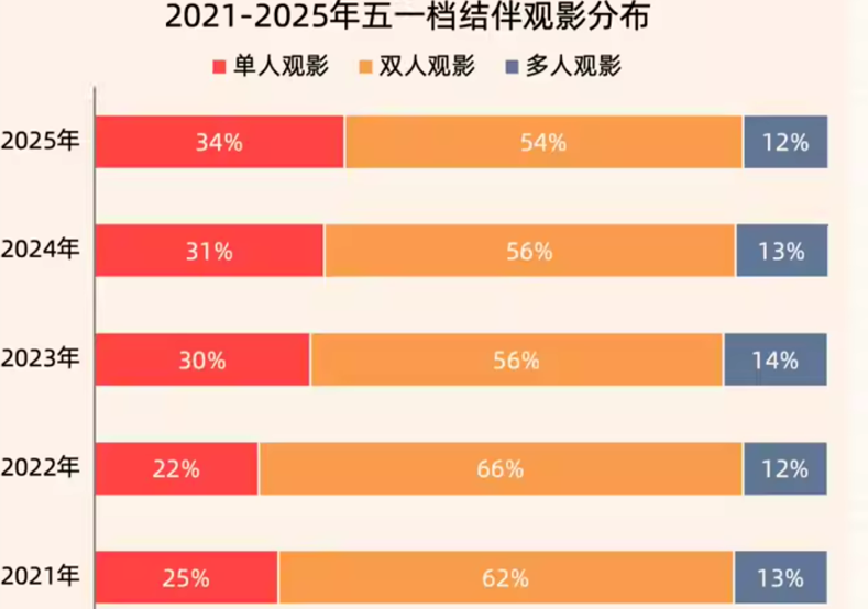 从2021年到2025年,五一档单均购票张数分别为1.93、1.94、1.91、1.86、1.82,单人观影比例,则分别为25%、22%、30%、31%、34%,不管是否排除2022年这一干扰因素,五一档单均购票张数和多人观影数都在下降,看电影正越发成为一个人的选择,而不是朋友、情侣和家庭的选择,这也正应和着当下大城市年轻人普遍独居、不谈恋爱的社会现状。