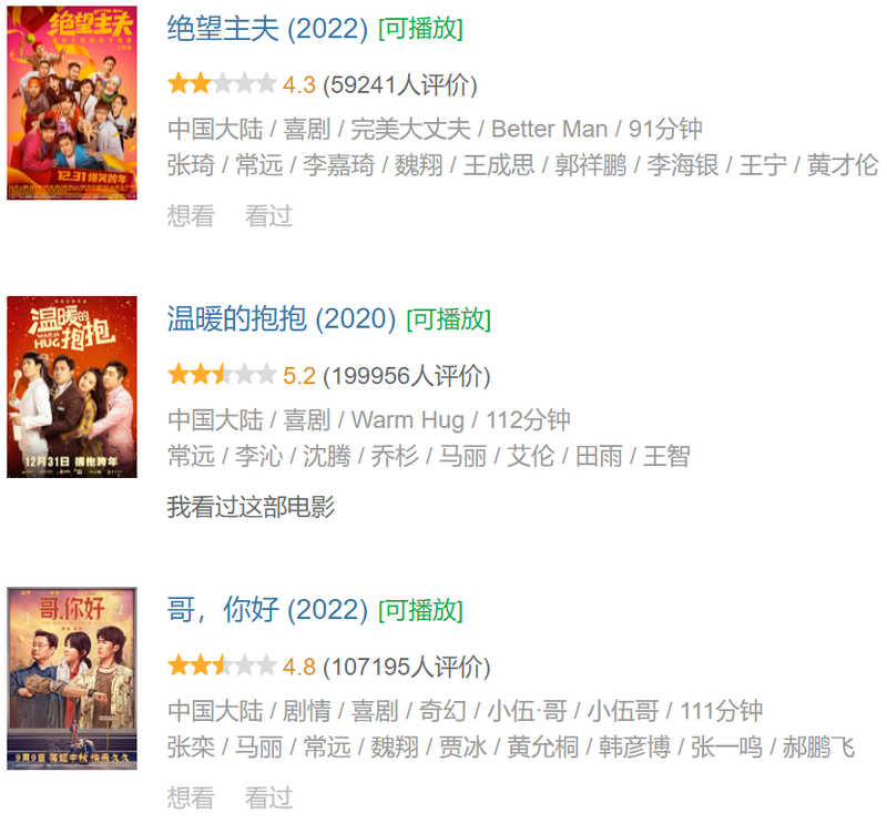 从演员阵容看,十年前的《万万没想到》,主演是凭借同系列网剧爆火的白客,前两年票房10亿+的《人生路不熟》,是乔杉+马丽组成夫妻档,加流量小生范丞丞,而《人生开门红》的男一号常远,与前两者相去甚远。