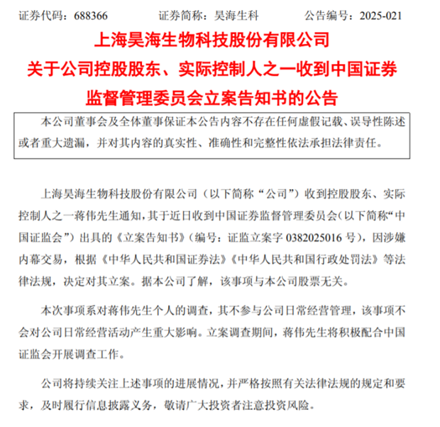 5月7日晚,昊海生科(688366.SH)公告称,收到公司控股股东、实际控制人之一蒋伟通知,其于近日收到中国证券监督管理委员会(下称“中国证监会”)出具的《立案告知书》,因涉嫌内幕交易对其进行立案调查。