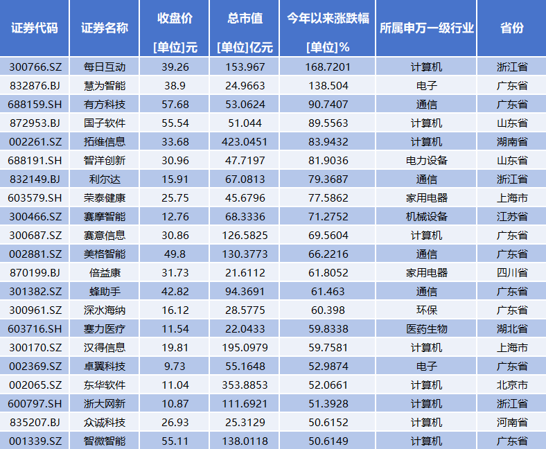 从二级市场表现看,今年以来涨幅超过50%的个股有21家。每日互动、慧为智能、有方科技涨幅位居前三,分别为168.72%、138.5%、90.74%。