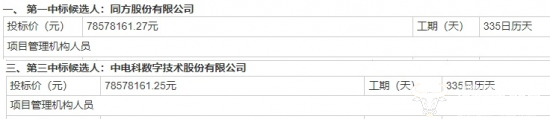 有意思的是,第一中标候选人同方股份与第三中标候选人电科数字的投标价非常相近,同方股份报价78578161.27元,电科数字的投标价为78578161.25元,两者投标价仅差0.02元,这是比较罕见的。这么复杂的报价数字,这两个企业居然能几乎一样,真难得!