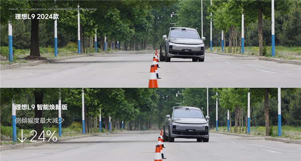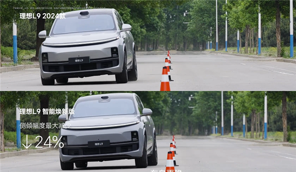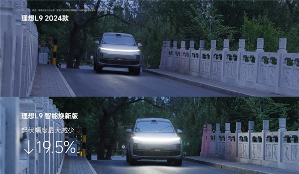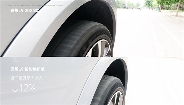 底盘部分,理想L9智能焕新版升级为双腔双阀魔毯空气悬架,升级后新车转弯侧倾最大可以减少24%,起步抬头和点头幅度可以减少12%,吸收振动的能力加强。