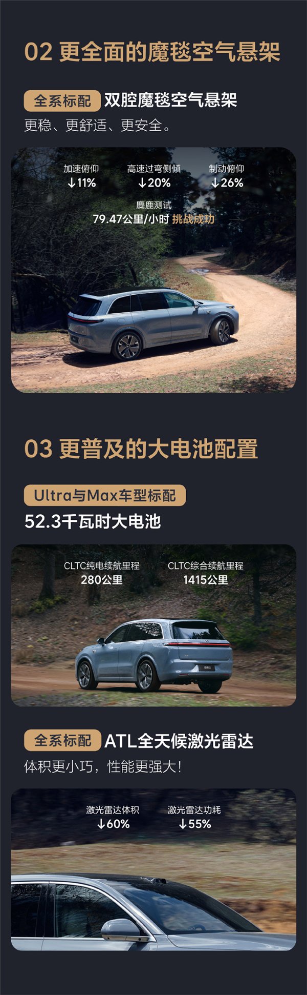 升级后,理想L8 Max的CLTC纯电续航从225公里提升至280公里,总续航从1360公里提升至1415公里,52.3度的大电池还具备更快的充电能力,25分钟即可从20%充至80%,大大缩短了充电时间。