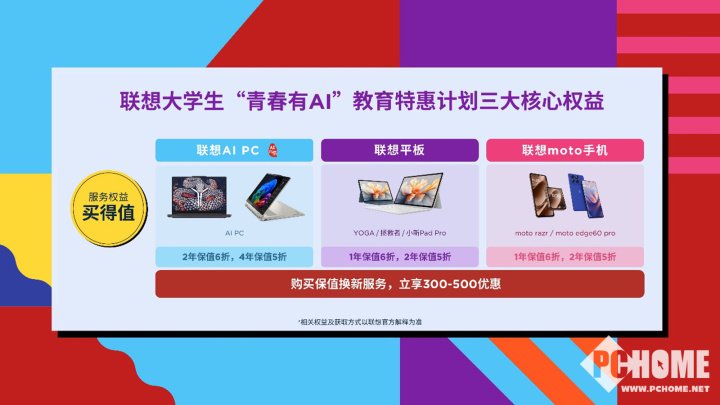 为赋能青年学子拥抱智能时代,发布会上,联想宣布正式推出“青春有AI”教育特惠计划,面向全国高校在校生及应届高考生,以三大核心权益构建成长支持体系。通过联想官方渠道完成学生认证,即可享全系产品专属低至9折优惠,叠加国家补贴后,最高优惠达4000元。其中旗舰机型联想拯救者Y9000P至尊版叠加教育优惠和国补后仅25499元;拯救者Y9000X AI元启版享受大学生专属教育特惠和国补后直降3000元,仅需11999元。联想 moto razr 60 Ultra AI元启版至高直降650元;联想YOGA Pad Pro 14.5顶配版直降1000元。针对设备迭代需求,联想特别推出保值焕新服务,设备保值,换新无忧。除此以外,还有针对大学生的成长权益,5月12日“青春有AI”大学生公众号将正式开放,参与活动,大学生有机会获得联想实习,甚至工作机会。