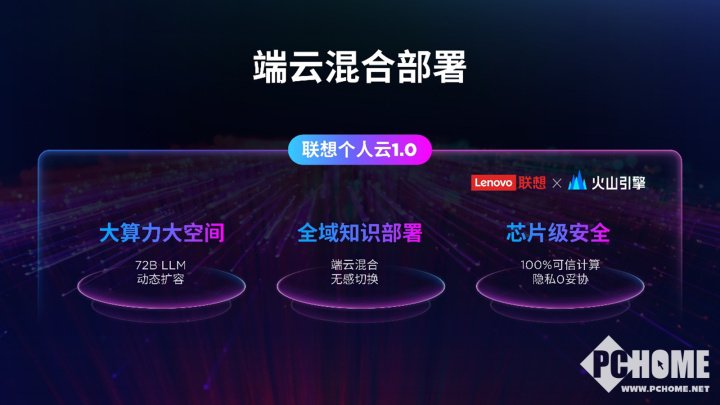 发布会上首发联想个人云1.0,这是联想与火山引擎共建的可信私密云方案,为每次AI执行,提供强大的数据安全和隐私保护。联想个人云搭载720亿参数大语言模型,为联想各类AI设备打破端侧AI算力的束缚。其为用户提供100GB起的专属记忆空间,结合RAG技术形成可扩展的知识库。天禧个人超级智能体将硬件芯片级加密安全能力延伸至云端,通过TEE加密、可信传输和计算容器等核心技术构建起安全壁垒,确保用户数据在使用过程中始终处于严密保护之下。深度融合端云混合架构的天禧个人超级智能体,以"中国首创、全球第一"的突破性技术,助力联想AI设备开启人机交互的全新想象空间。
