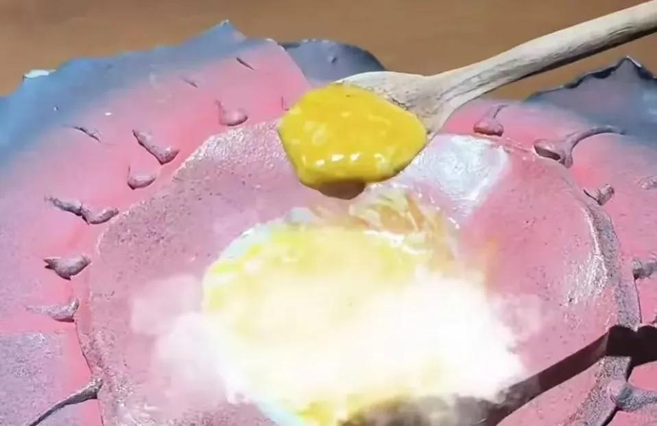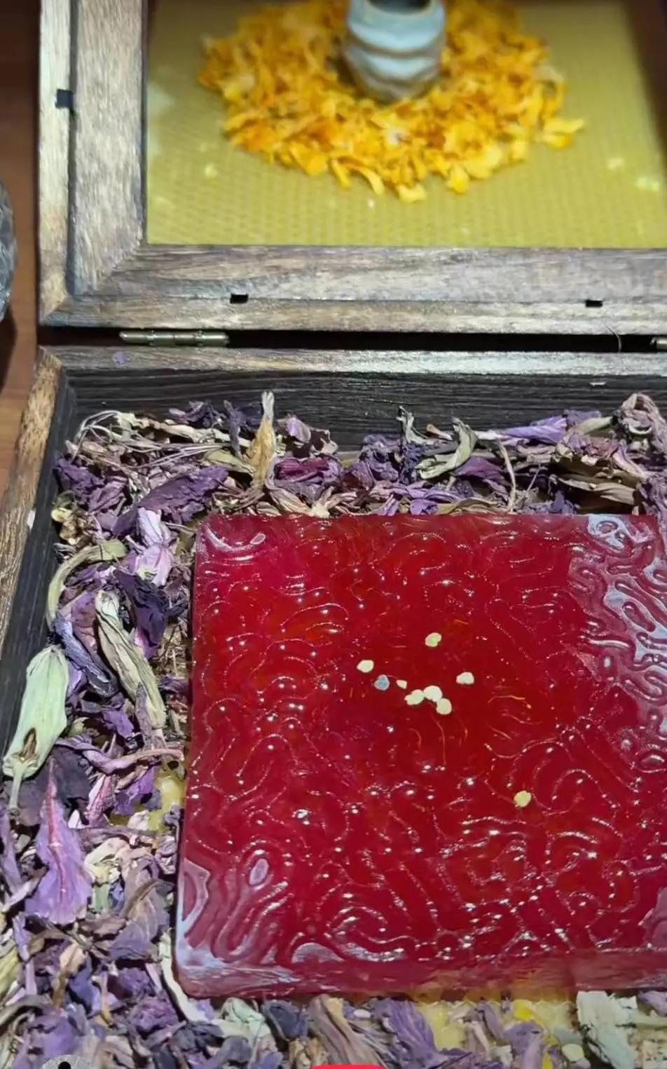 接下来一道菜,是一块粉红色的冰,冰上喷有蜂蜜和花粉。