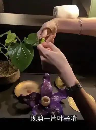 第二道菜,原材料是来自云南景迈山的香柳叶。服务人员一顿操作猛如虎,先用液氮冷却叶子,再“啪”地拍碎,撒在奶油上。据讲解,此番操作可以带来一种雨林的气息。