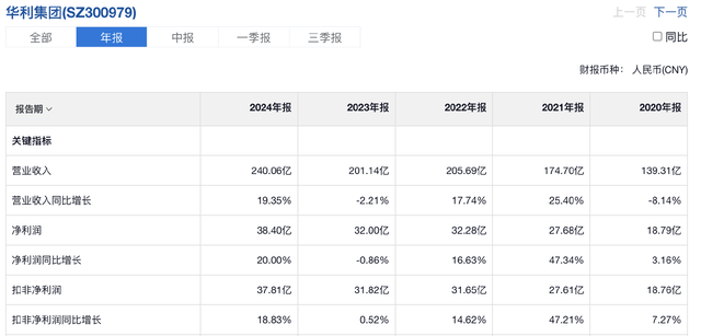 按理说,客户相近、同属于纺织业的申洲国际如此,华利集团应当也差不多,但事实并不是这样的。我们看华利集团的业绩,明显和申洲国际就是两码事,也就2023略有停顿,2024立马就重新崛起。2024年实现营收240.06亿元,同比增长19.35%;净利润38.4亿元,同比增长20%。一直以来,他的利润都非常稳得住。