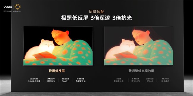 为了配合多样化的居室环境,Vidda贴贴壁纸电视提供了65英寸、75英寸、85英寸和100英寸等不同尺寸。其中100英寸款拥有2640个QD-Mini LED背光分区,峰值亮度达XDR 4400尼特。为了实现更好的画质和更逼真的壁画效果,无惧环境强光的影响,Vidda贴贴壁纸电视还配备了独家的极黑低反屏。其拥有行业最高规格的0.5%低反膜,图像深邃度和屏幕抗光性都达到普通屏幕的3倍,原生对比度更是高达7000:1。相比常见的磨砂屏抗光方案,Vidda选择了成本更高但画质更好的极黑低反屏。