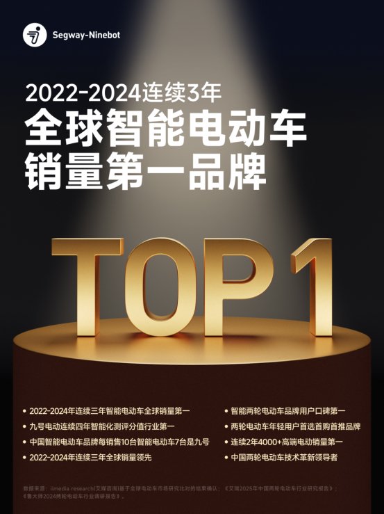 九号公司在全球智能两轮电动车领域的领导地位也再度获得权威认可。根据艾媒咨询与艾瑞咨询发布的数据,九号已连续三年蝉联全球智能电动车销量第一,连续四年智能化测评分值行业最高,在中国智能电动车市场中,每售出10台智能电动车,就有7台来自九号。更在4000元以上高端市场中连续两年排名第一,是名副其实的技术革新引领者与用户口碑首选。