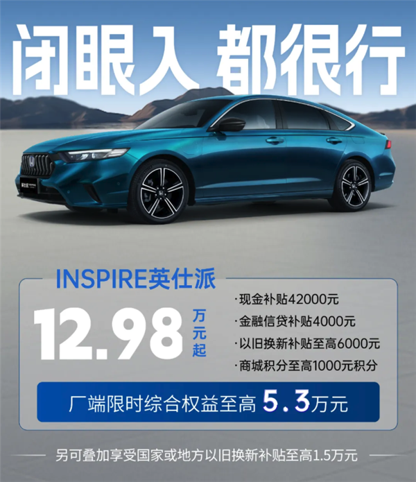 英仕派限时售12.98万起,厂端限时综合权益至高5.3万元,包含现金补贴42000元、金融信贷补贴4000元、以旧换新补贴至高6000元、商城积分至高1000元积分。