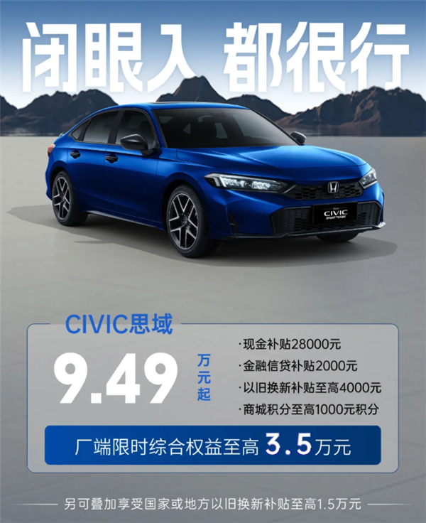 本田思域限时9.49万元起,可享厂端限时综合权益至高3.5万元,包含现金补贴28000元、金融信贷补贴2000元、以旧换新补贴至高4000元、商城积分至高1000元积分。
