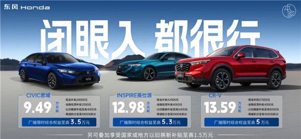 快科技5月9日消息,擅长打造“神车”的本田也绷不住了,近日,东风本田发布了5月购车优惠活动,在5月8日至31日期间,购买本田CR-V、INSPIRE英仕派、CIVIC思域均可享受限时综合优惠。