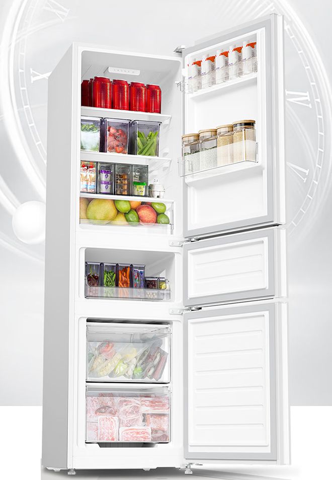 该产品配备三门 216L 容量,其中冷藏保鲜 129L、中门微冻 30L、冷冻保存 57L。对比上一代产品,容积率提升 4.8%。冰箱运行状态下噪音低至 36 分贝,低于国家标准中对于电冰箱噪音的限值。